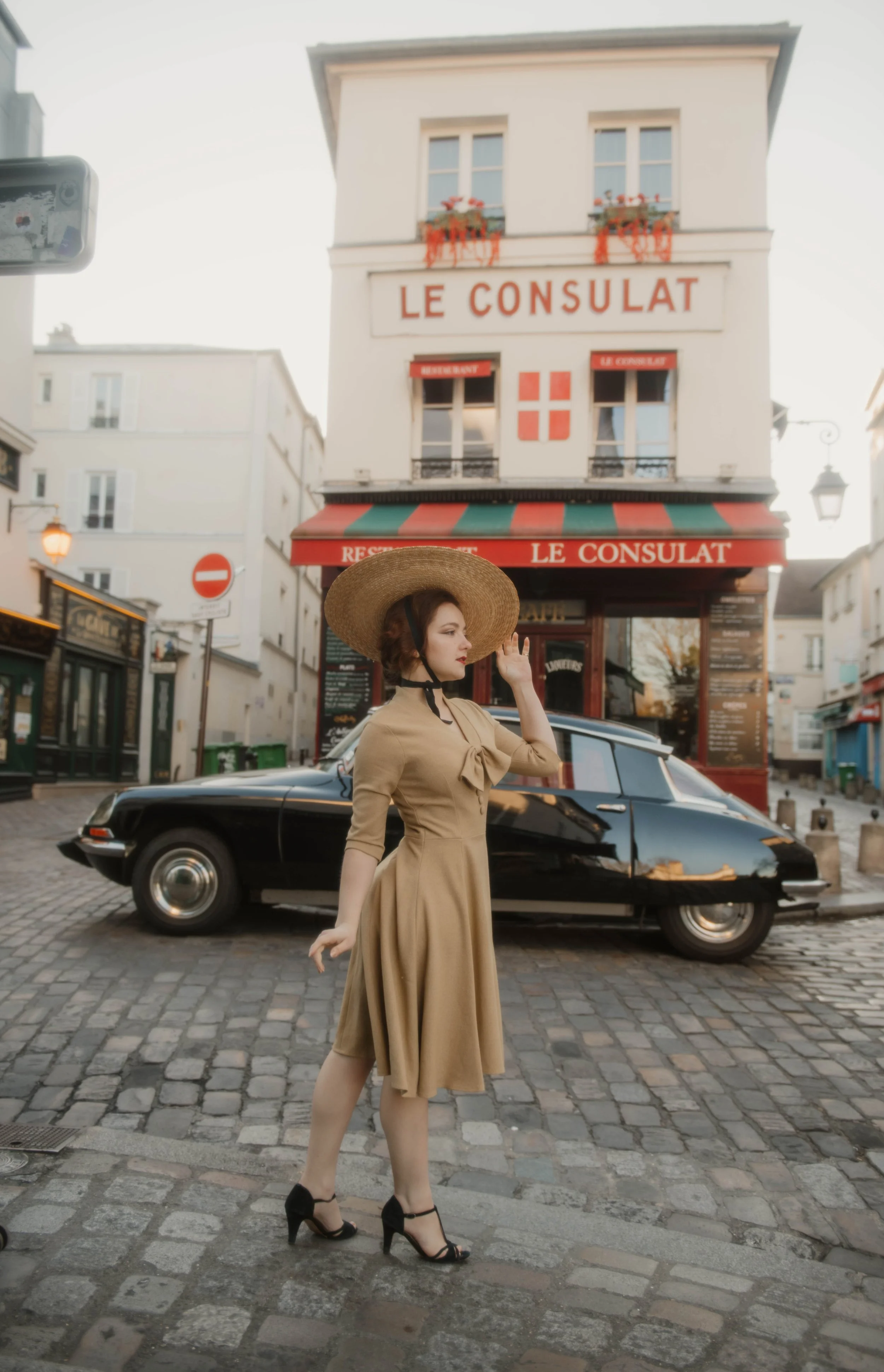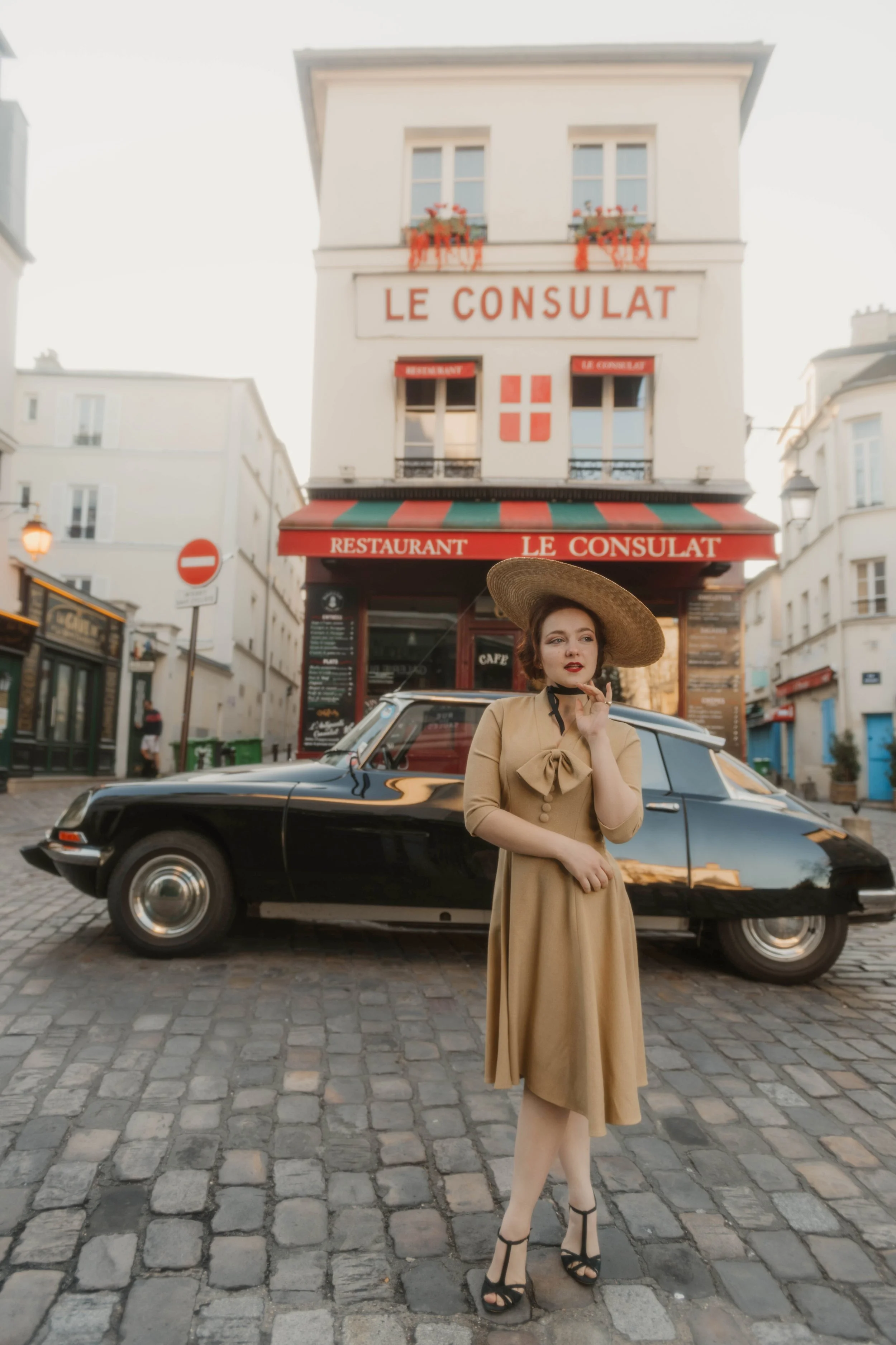 The shoot began on Norvins street at the historic restaurant "Le consulat". There, we met the car and started taking the first photos, taking advantage of the beautiful surroundings and morning light.